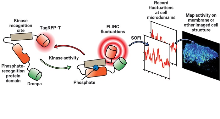 Şimdi, California Üniversitesi’ndeki, Jin Zhang ve meslektaşları, hücresel işlemleri yeni bir şekilde aydınlatan ve yaklaşık 100 nm’lik bir çözünürlüğe kadar SOFI ile saptanabilir olan biyolojik sensörler geliştirmişlerdir (Nat. Metodu 2017, DOI: 10.1038 / Nmeth.4221).İki floresan proteininin birbirlerine yakın temas ettiği zaman flüoresans dalgalanmalarının hızlandığı, temas tarafından arttırılan FLINC-Floresans dalgalanma adlı yeni bir biyo-algılama fenomenini keşfettiler. FRET (floresan rezonans enerji transferi) ve BiFC (bimoleküler floresan tamamlama) FLINC’yi anımsatan mekanizmalara sahiptir. Fakat FRET, süper çözünürlüklü görüntüleme ile kolayca uyumlu değildir ve BiFC, dinamik biyolojik aktiviteyi izleyemeyen tek seferlik, geri dönüşsüz flüoresans oluşturma süreci için kullanılmaktadır.