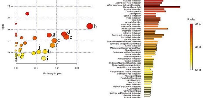 Fotoğraf : H2O2 ile hasar görmüş hücrelerde düzenlenmiş metabolik yolaklar, (a) kabarcık grafikleri ve (b) genel bakış. a: Alanin, aspartat ve glutamat metabolizması; b: taurin ve hipotaurin metabolizması; c: glutatyon metabolizması; d: piruvat metabolizması; e: glisin, serin ve treonin metabolizması; f: pantotenat ve CoA biyosentezi; g: metan metabolizması; h: glioksilat...
