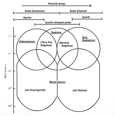 Şekil-1: Sıvı kromatografinin uygulamaları. Diyagramın sağ tarafındaki kromatografi tipleri, polar bileşikler için uygundur. Diyagramın altındaki teknikleri ise, büyük mol kütleli türler için en uygundur.
