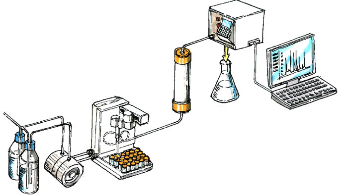 HPLC’nin temel çalışma prensibine göre, detektör çözücü ve çözelti arasındaki karakteristik değişiklikleri ölçer. Bu değişiklikler monitörde görüntülenir. Diyagramda; çözücünün geçtiği bölüm, örneği sabit bir akış hızıyla cihaza iter. Enjektör,örneği sıvının içinden geçtiği kolona alır. Kolon, araştırılan maddeyi örnekteki diğer maddelerden ayıran silikon boncukların bulunduğu paslanmaz çelikten yapılmış tüptür. Dedektör, çözeltideki değişiklikleri belirleyen optik sensördür. Monitör, sistem elemanlarının kontrolünü, verilerin kaydedilmesini sağlar.