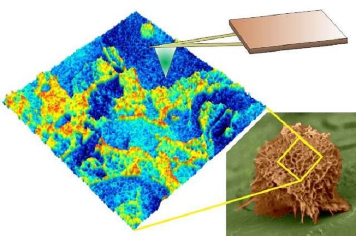 Igor Sokolov, “Bu görüntüleme modu yeni malzeme ve proseslerin geliştirilmesine yardımcı olacak” diyor. Görüntüde, bir kanser hücresi etrafındaki perisellüler (hücre veya hücreleri saran) tabakanın yüksekliğini gösteren bir hücre yüzeyi gösterilmektedir. Credit: Maxim Dokukin and Igor Sokolov