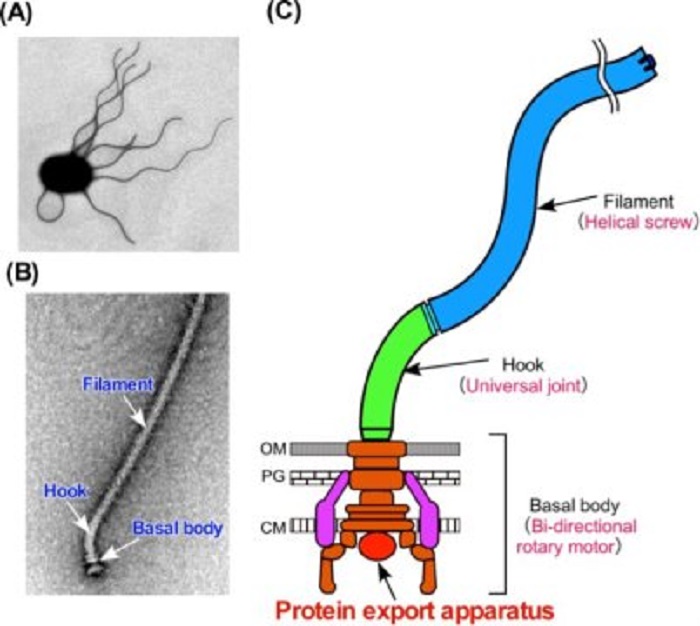 Bakteri kamçısı. (A) Bir Salmonella hücresinin elektron mikrografisi. (B) Salmonella kamçısının elektron mikrografisi. (C) Kamçının şematik diyagramı. Kamçı en az üç parçadan oluşur: iki yönlü döner bir motor gibi bazal gövde, kardan mafsalı gibi kanca ve helezonik bir vida gibi filament.