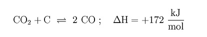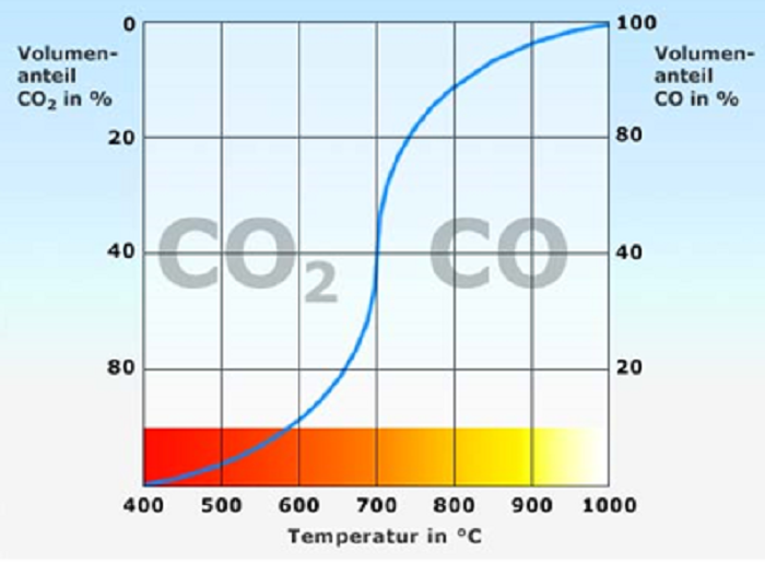 Reaksiyonun anlaşılması, kurum üretimini en aza indirirken yakıt kullanımını maksimize etmek için yüksek fırın tasarımında önemli bir faktördür. Aşağıdaki grafikte artan sıcaklıklara karşı karbon dioksit ve karbon monoksit yüzdesi ifade edilmiştir.
