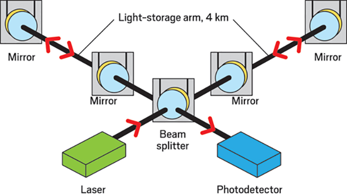 İşte LIGO bu olayları nasıl algılıyor. 120 mm genişliğinde bir lazer ışığı ışını, 4 km’lik kolların her iki ucunda asılı duran bir çift ayna arasında ileri geri sallanır.
