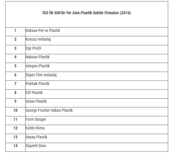 İstanbul Sanayi Odası’nın (İSO) “Türkiye’nin 500 Büyük Sanayi Kuruluşu” 2016 yılı listesi, Türkiye plastik sektörünün bir kez daha ağırlığını koruduğunu ortaya koydu. Plastik Sanayicileri Derneği’nin (PAGDER) listedeki verilere ilişkin yaptığı değerlendirmeye göre, ilk 500 büyük arasında yer alan 14 plastik sanayi işletmesinin üretimden net satışları, yüzde 5,4 oranında düşüş gösterdi.