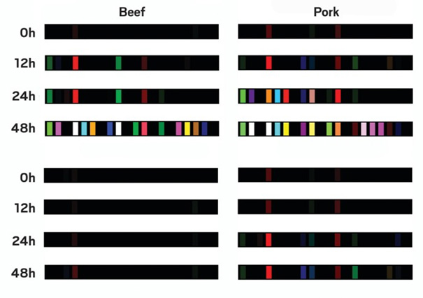 Dana sığır etinden (solda) ve domuz eti örneklerinden (sağda) oluşan koku yeni bir tazelik sensöründe benzersiz renk desenleri üretir. 48 saat boyunca, oda sıcaklığında depolanan örnekler (üstteki dört sıra), bozulmayla ilişkili bileşikleri giderek artan bir şekilde verirken, bir buzdolabında (alttaki dört sıra) depolananlar bu kadar çabuk gidermez.