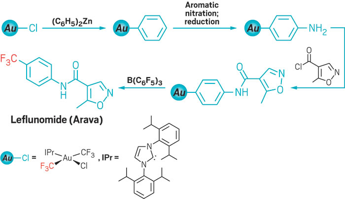 Tıpla ilgilenen kimyagerler oluşturacakları ilaçlara triflorometil grupları eklemeyi severler. Çünkü sübstitüenler kabaca bir mileketoast metil boyutundadır, ancak C-F bağları sayesinde moleküller metabolizmaya direnç kazandırarak, bileşiklerin vücuda daha uzun süre dolaşmasına yardımcı olurlar. Şimdi, Berkeley, California Üniversitesi’nde F. Dean Toste ve kimyagerlerden oluşan ekibi, moleküllere triflorometil sübstitüentleri eklemek için yeni bir metot bildirmişlerdir. James P. O’Neil liderliğindeki Lawrence Berkeley Ulusal Laboratuvarı’ndaki araştırmacılarla birlikte çalışan kimyagerler, triflorometil grubunda bir 18F ile moleküller yapmak için reaksiyonu adapte etmişlerdir ve pozitron emisyon tomografisi için radyoaktif işaretlenmiş bileşikler yapmak için yeni bir yöntem meydana getirmişlerdir(PET). Reaksiyon, triflorometilleştirilmiş ürünü üretmek için bir tris (pentafluorofenil) boran katalizörü ve stokiyometrik miktarda altın kompleksi kullanmaktadır (Science 2017, DOI: 10.1126 / science.aan1411). Altın kompleksi, Au-C bağını parçalamadan, alüminyum hidrid indirgeme, Simmons-Smith siklopropantasyon, ozmiyum katalizörlü dihidroksilasyon, periyodat aracılı diol bölünmesi ve paladyum katalizörlü çapraz bağlanma dahil olmak üzere çok çeşitli reaksiyonları tolere etmektedir. Kompleks, romatoid artrit ilacı leflunomid (Arava) sentezinde kullanıldığında aromatik nitrasyonun sert reaksiyon koşullarına bile direndiği görülmüştür.