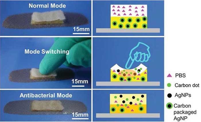 Akıllı bandaj fosfat tamponlu salin (belli ölçülerde sodyum bikarbonat ve sodyum klorür içeren distile su çözeltisi) tabakasının altında karbon içinde paketlenmiş gümüş nanopartiküller (AgNPs) içerir. Bandaja baskı yapılması katmanların etkileşime girmesine ve antibakteriyel gümüş parçacıkların serbest bırakılmasına neden olur.