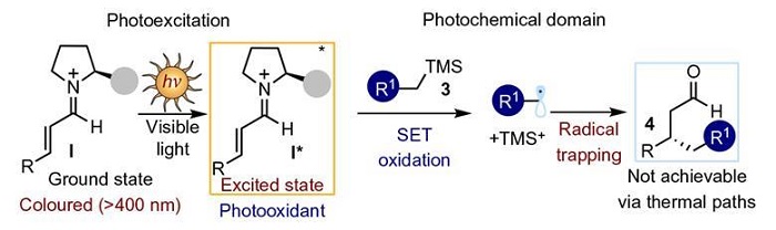 Kiral enaminlerin; substratların ışıkla uyarılmasına doğrudan etkisinin olduğu ve bu sayede kiral ürünlerin stereo-kontrollü oluşumunu teşvik ettiği yakın zamanda ortaya konulduktan sonra ekip, ışıkla uyarılmış iminyum iyonlarının güçlü bir yükseltgen görevi görebileceğini ve yeni reaksiyonların yolunu açabileceğini belirtti. Bu amaçla araştırmacılar, genellikle stereoselektif iminyum iyon-katalizli termal reaksiyonlarda kullanılan, piyasada bulunabilen diarilprolinol silileter katalizörünü kullanarak bir amino asit olan prolin’e dayalı organokatalizörler yaptılar.
