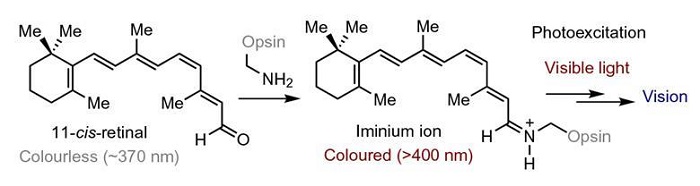 Omurgalı görüşünde; 11-cis-retinal, bir opsine ait lisin çökeleğiyle reaksiyona girdiğinde oluşan iminyum iyonları görünür ışık ile uyarıldı.